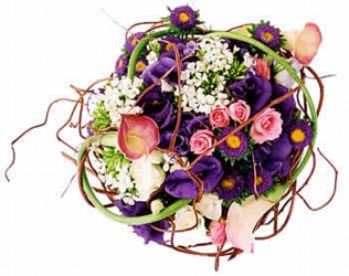 大人のパープルをやわらかな印象で入れました。グルーピングして花を入れているので、個性的な仕上がりです。 |